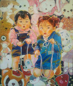 ![]() 絵画 『未だ日は愛し』渡部祥帆 「”曖昧”の形」をテーマに制作しました。今まで自分が作品を制作する中で、曖昧なままにしてきた様々なものと向き合いたいという思いを、物の輪郭を際立たせる光と、それを求める、顔のない物質的な生物たちで表現しました。 | ![]() 絵画 『sis』藤崎花帆 2001年3月の私と姉、そして思い出のぬいぐるみや玩具を描きました。ぬいぐるみたちはきっと知っているのです。幼い頃の私はいつも5歳上の姉の背中を追いかけていたこと。影響を受けてばかりの自分が悔しかったこと。そんな時期はいつの間にか過ぎて大人になってしまったこと。そして、昔も今も、私たち姉妹は特別で大切な親友のような関係であること。 |