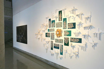 ![]() 絵画 『そして接続する』佐々木友見 この作品は「夢と記憶」の繋がりをテーマに制作しました。扉や箱の中は「夢」(画像上では見られません)、外側は「記憶」を表現しています。本来は、鑑賞者が記憶を見てから扉を開けることで夢との繋がりを確認するものとなっています。 |